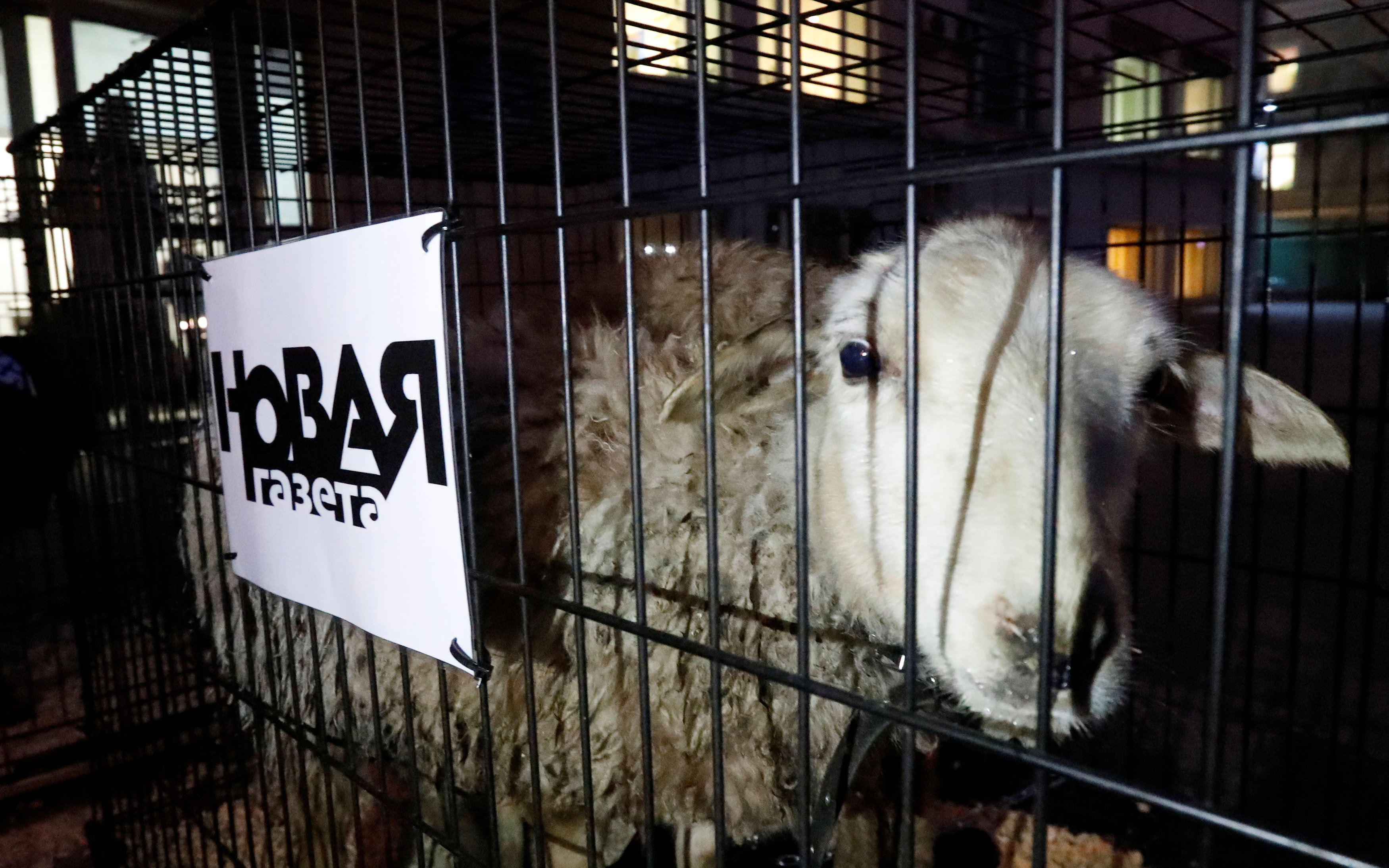 Три клетки с девятью овцами, на которых были надеты жилеты с надписью "пресса", привезли к зданию редакции "Новой газеты" в Потаповском переулке в Москве в понедельник днем.
