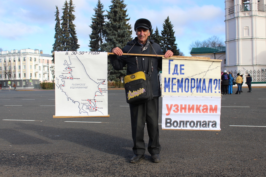Глава фонда помощи жертвам Волголага Владимир Крутченский 30 октября, в день памяти репрессированных приехал из Рыбинска в Ярославль и встал в одиночном пикете у здания правительства региона. Он напомнил властям о нереализованном проекте памятника репрессированным строителям Волжской ГЭС. На месте событий побывал корреспондент «7x7».