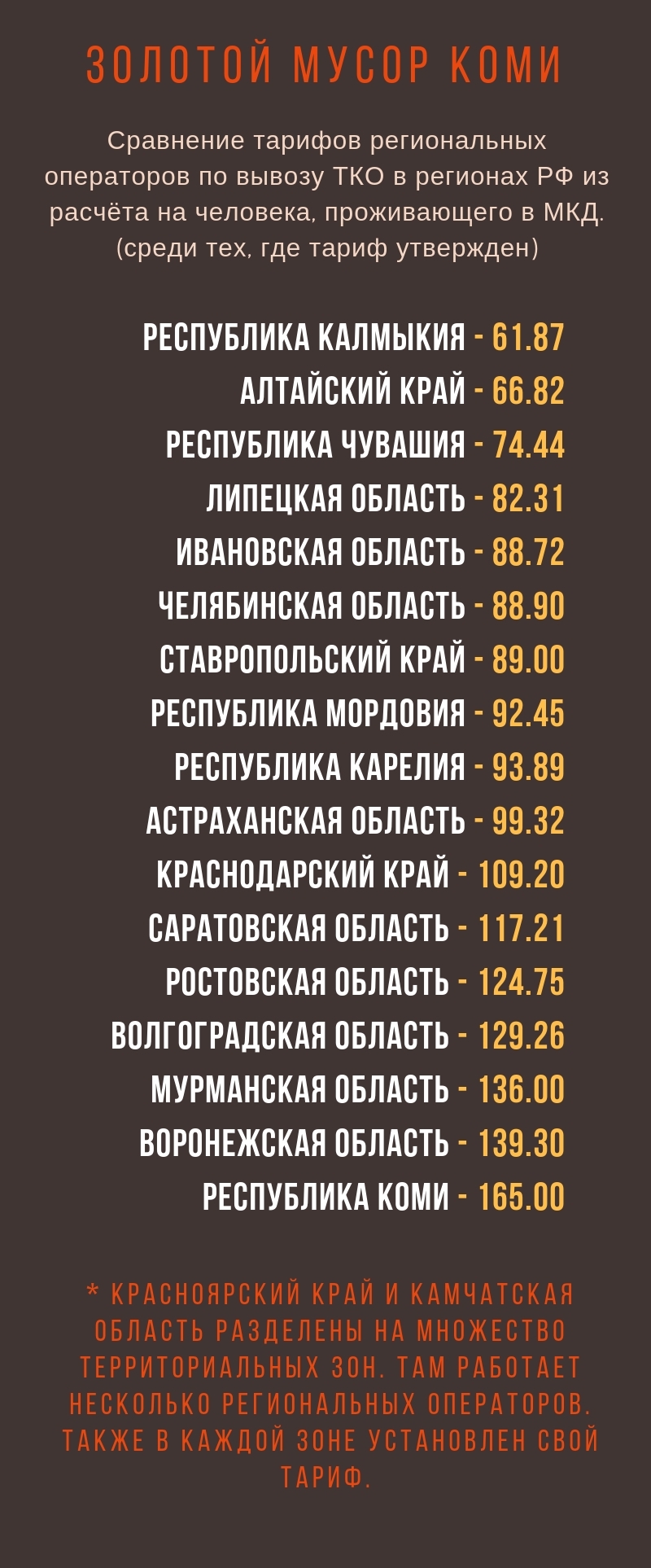 Сегодня, 1 ноября, начал свою работу региональный оператор по вывозу твердых коммунальных отходов (ТКО) в Республике Коми — ООО «Ухтажилфонд». Скоро мы с вами получим замечательные платежки об оплате данной коммунальной услуги (да-да, теперь уже это коммунальная услуга). Пока вы еще не осознали этот неприятный факт, а его принятие наступит куда позже, предлагаю вам взглянуть на сравнение тарифов региональных операторов в других регионах Российской Федерации и понять, насколько наш тариф все же высокий.