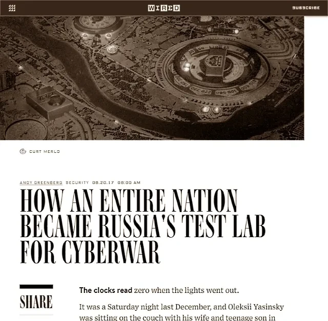 На портале журнала Wired — культового промеж интеллектуалов, влюбленных в информационные технологии, есть закрепленный раздел Most Popular. В первой пятерке самых популярных публикаций, в окружении сплошь свежих статей, устойчиво зависает текст Энди Гринберга, озаглавленный «Как целая нация превратилась в тестовую лабораторию России по ведению кибервойны», написанный в июле 2017.