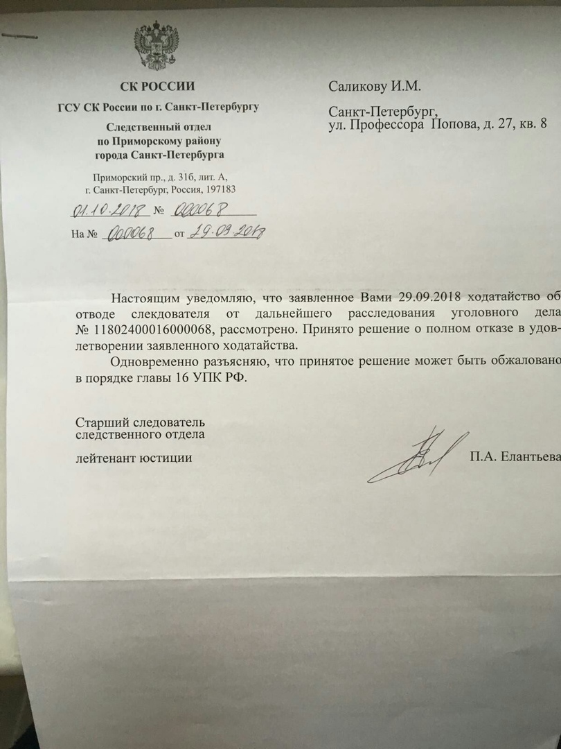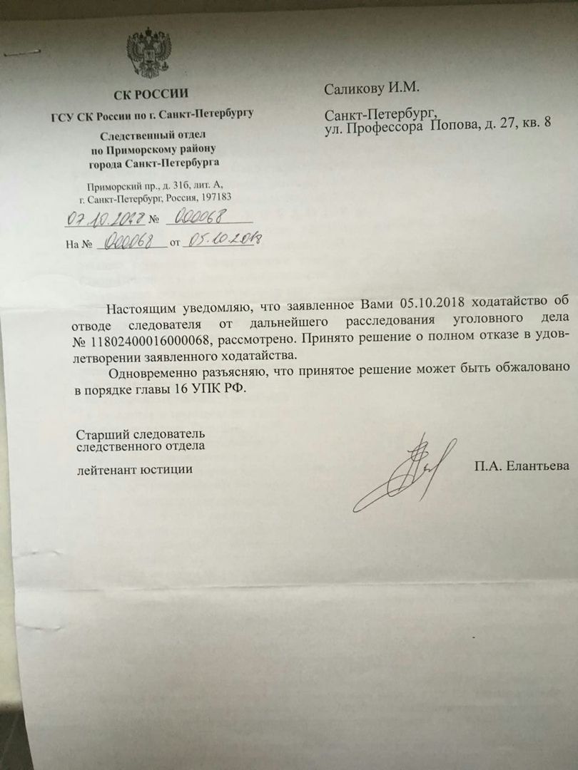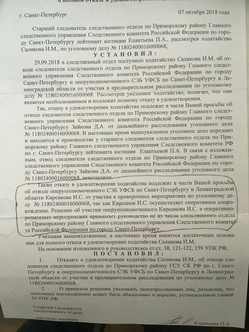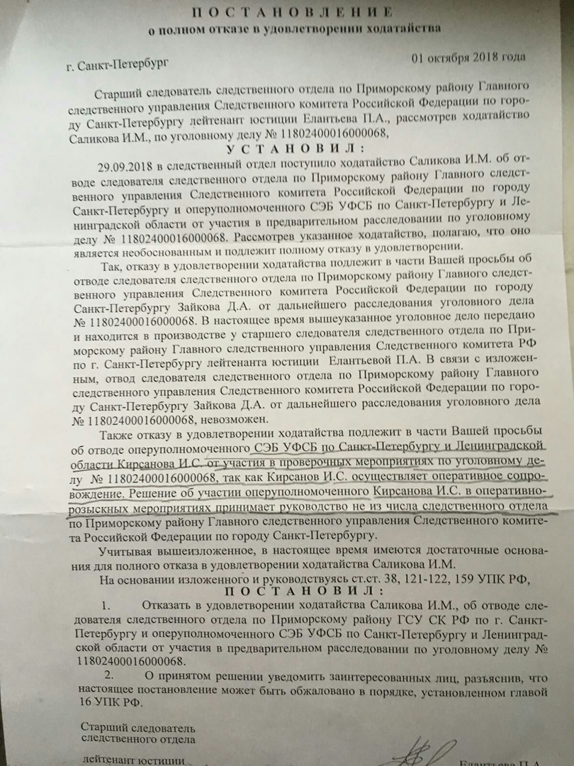 Из документов также следует, что Саликов за последнее время два раза просил отстранить Кирсанова от расследования уголовного дела, однако получил отказ, потому что «решение об участии Кирсанова в оперативно-розыскных мероприятиях принимает руководство не из числа следственного отдела [района]».
