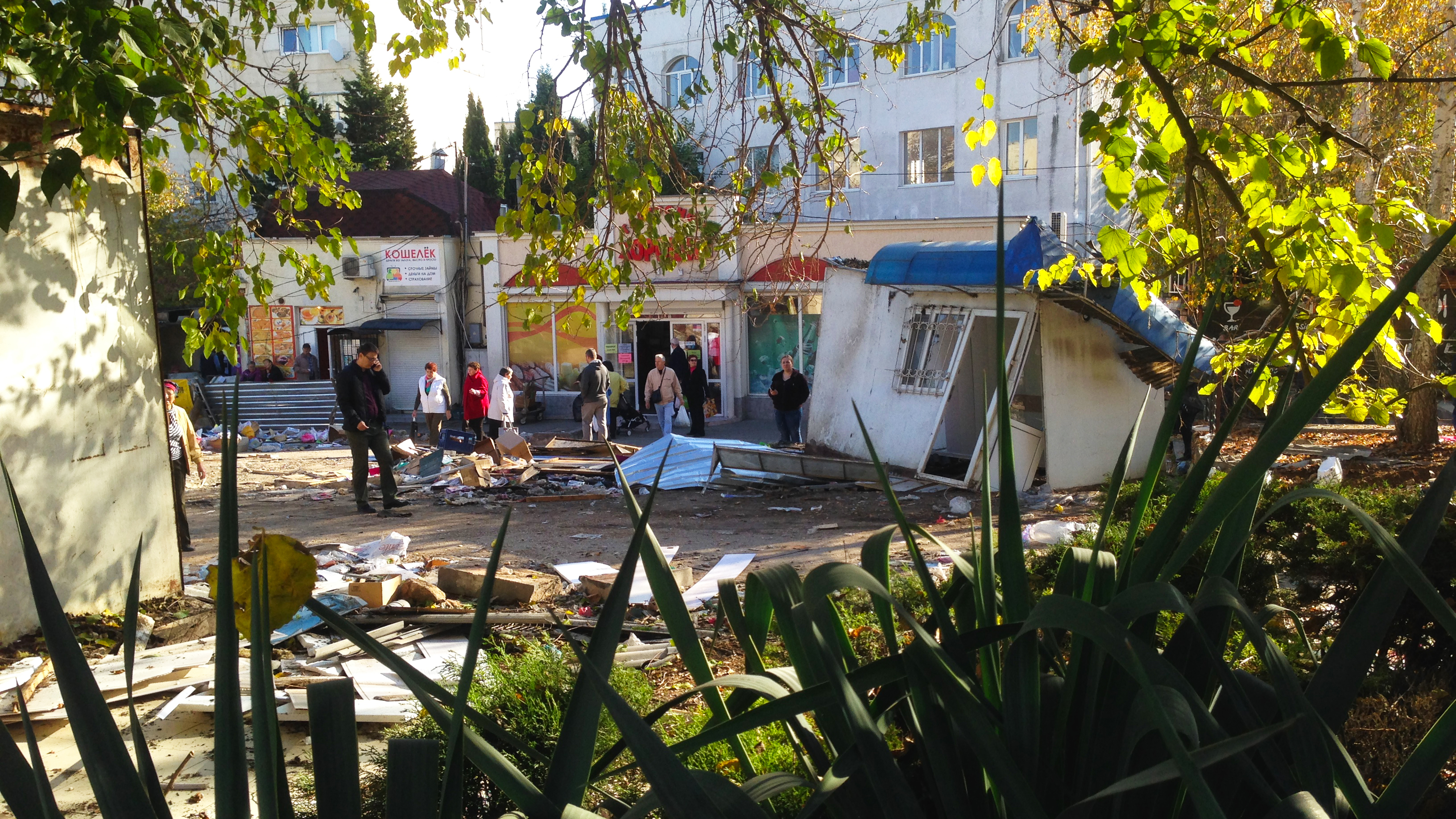В аннексированном Крыму и Севастополе местные власти борются с коммерческими строениями, которые объявили «незаконными», в том числе под снос идут магазины, кафе, торговые палатки на рынках и пансионаты.