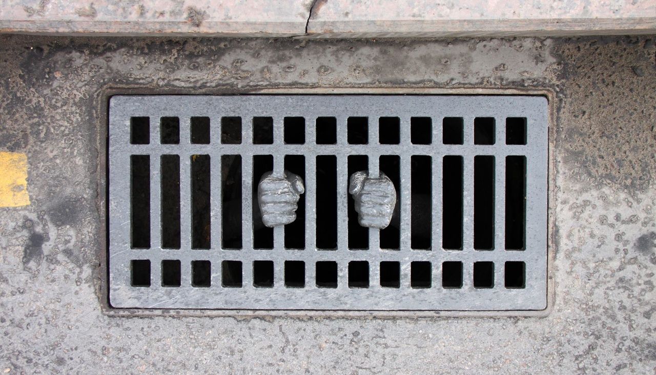 Художник Слава Птрк установил на набережной в Москве напротив Кремля канализационную решетку с приваренными к ней руками — так, будто под ней находится человек, который держится изнутри за прутья.