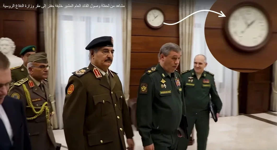 На 23-й секунде записи маршал Хафтар проходит по коридору, в кадр попадают настенные часы, на них — 13 часов 55 минут.