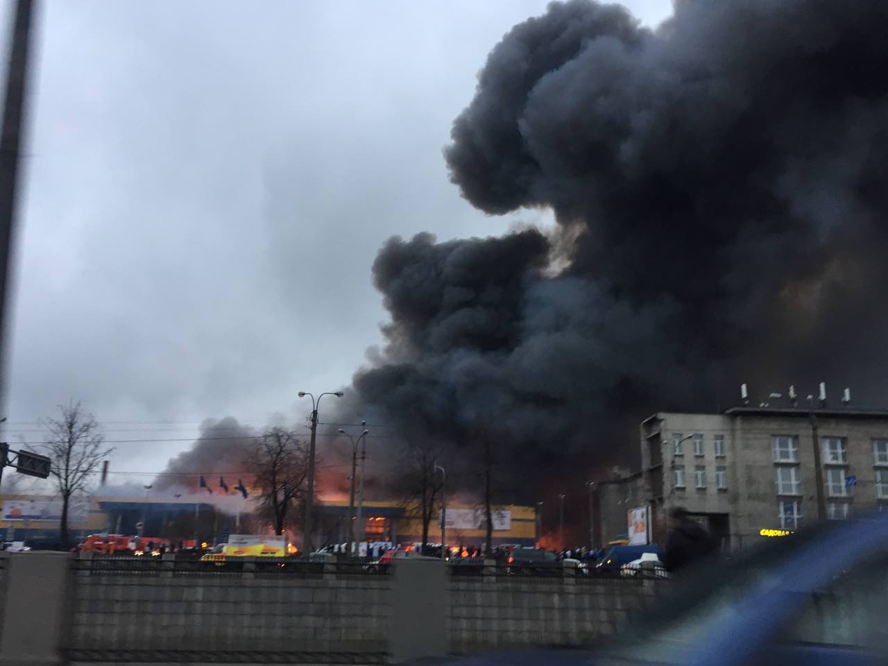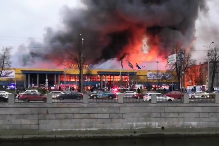 Пожару присвоили повышенный уровень сложности № 3. Телеграм-канал Mash сообщает, что при пожаре обрушилась одна из стен гипермаркета. «Фонтанка» пишет об обрушении кровли.