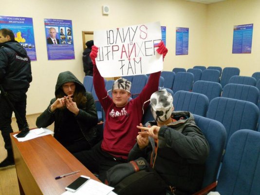 Одиночные пикеты проходили рядом с ДК «Ленсовета»: у входа, а также справа и слева от него. Плакаты были «Юлиус Штрайхер здесь» и «Юлиус Штрайхер там». Это единственный человек, приговоренный на Нюрнбергском трибунале к высшей мере наказания только за пропаганду: он непосредственно не участвовал ни в войне, ни в геноциде. Это либо аналогия, либо предостережение: каждый понимает по-своему.