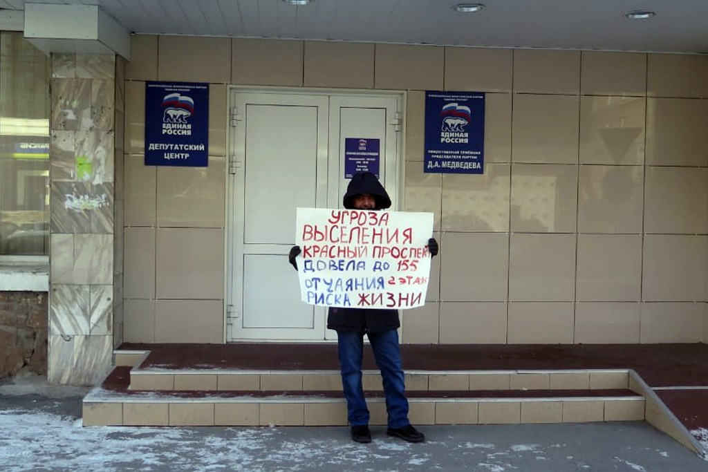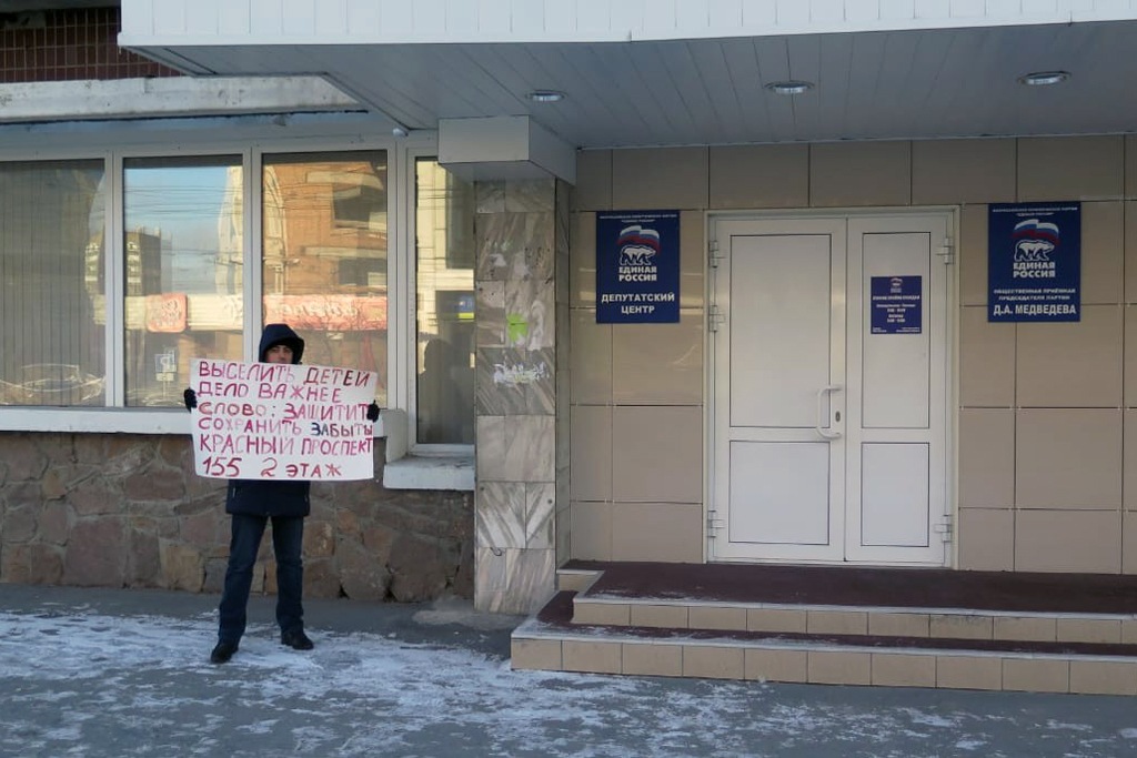Жители дома на Красном проспекте, 155 на площади Калинина провели серию одиночных пикетов. Они встали с плакатами у входа в приемную председателя «Единой России» Дмитрия Медведева.
