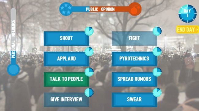 В The Protester вы можете повлиять на исход протестов. Самый важный ресурс — время. Ежедневно у вас только 12 часов. Время можно потратить тремя способами: на поиск информации и полезных контактов в интернете, на социальные сети и на уличный протест. Ваши действия влияют как на ваше личное влияние и известность (шкала слева), так и на общий потенциал протеста (сине-красная шкала сверху). Агрессия, драки и распространение слухов вызовут отторжение к вам и ко всем митингующим в целом. То же самое — с лайком или расшаром информации, которая полезна правительству. А вот интервью, хлопанье в ладоши, бодрые речевки и распространение позиции протестующих повысит их (и ваши) котировки.