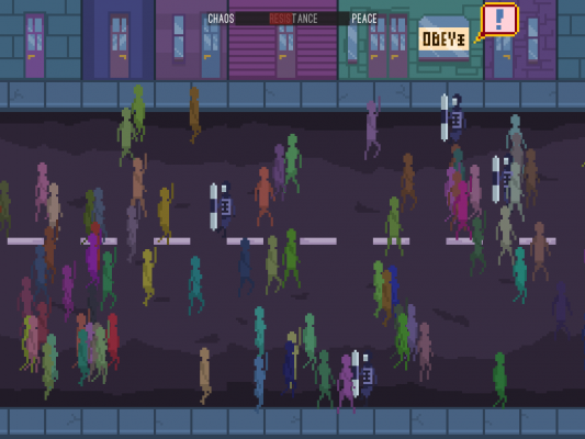 Весной 2017 года прошел ResistJam — в течение недели активисты и создатели игр со всего мира общались и разрабатывали игры, критикующие авторитаризм и силовые структуры. В итоге получилось 211 игр — все можно скачать за фрипрайс или запустить в браузере по ссылке. Disrupt — одна из них.