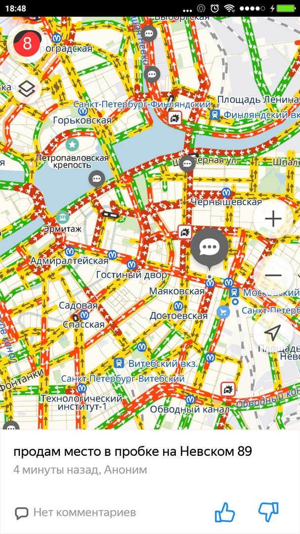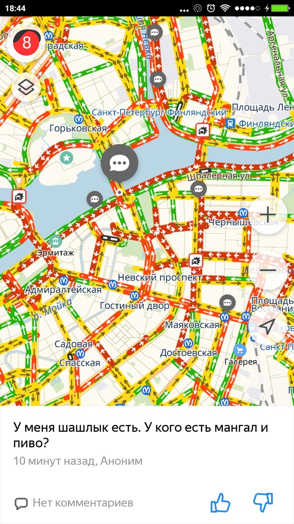 В «разговорчиках» сервиса водители обсуждали Культурный форум, пытались продать место в пробке и хотели поделиться шашлыком в обмен на мангал.