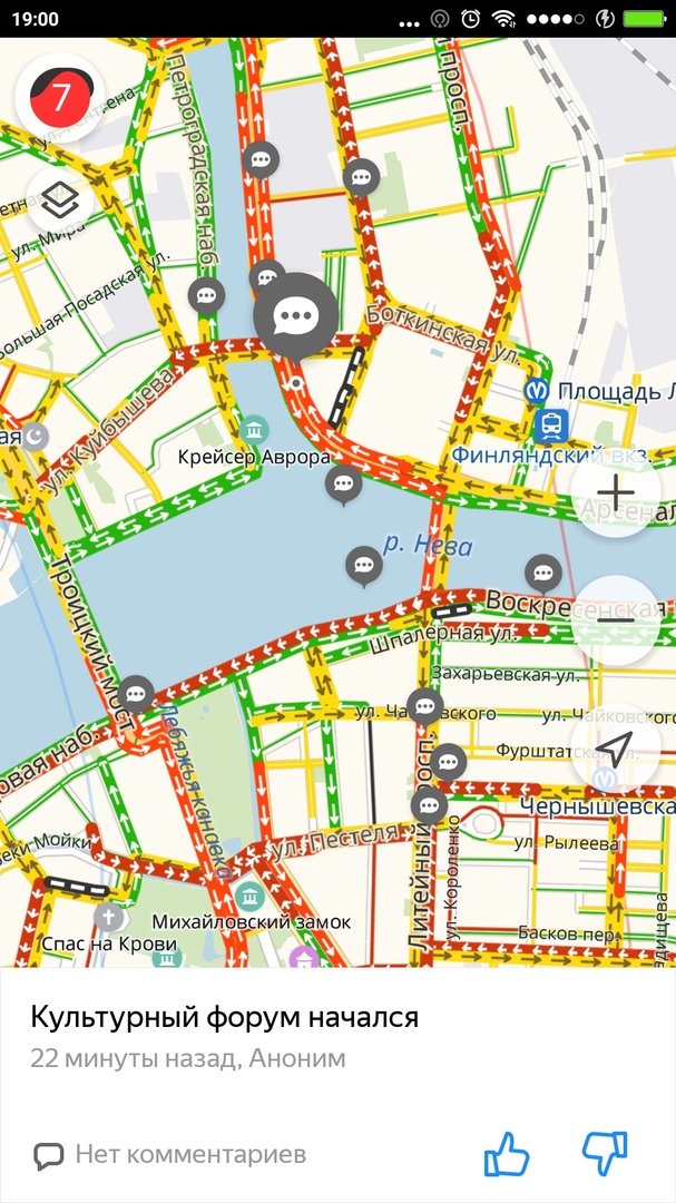 Большие пробки собрались на Невском проспекте, улице Пестеля, Дворцовом мосту, а также на Выборгской и Воскресенской набережных.