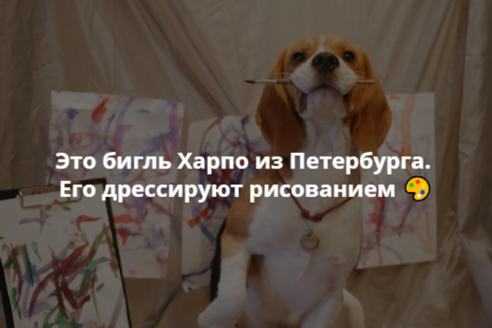 Петербургский архитектор Анастасия Лапшина ведет блог своего щенка Харпо в Instagram, в котором показывает профессиональные фотографии собаки. Недавно там стали появляться снимки Харпо, рисующего с кисточкой в зубах на мольберте, — так его дрессируют несколько раз в неделю.