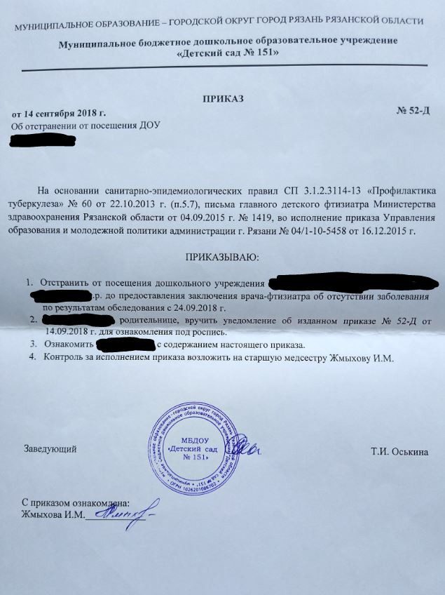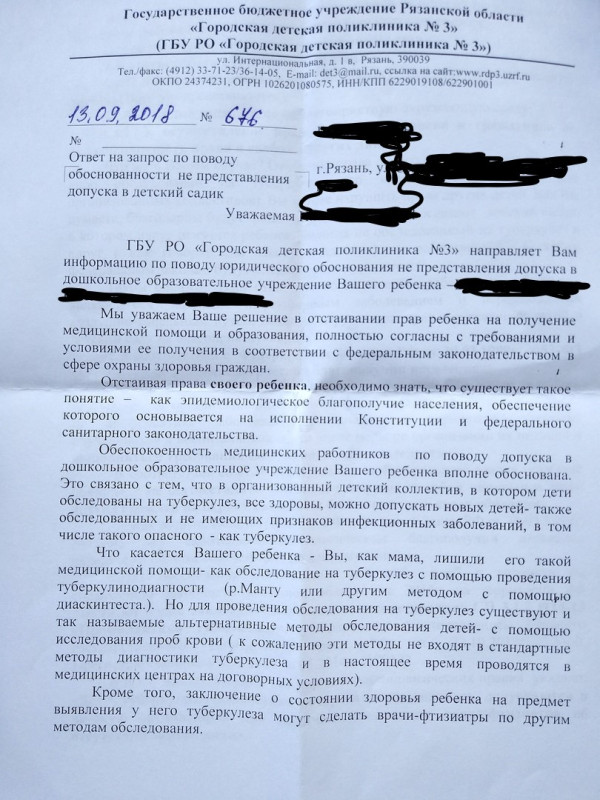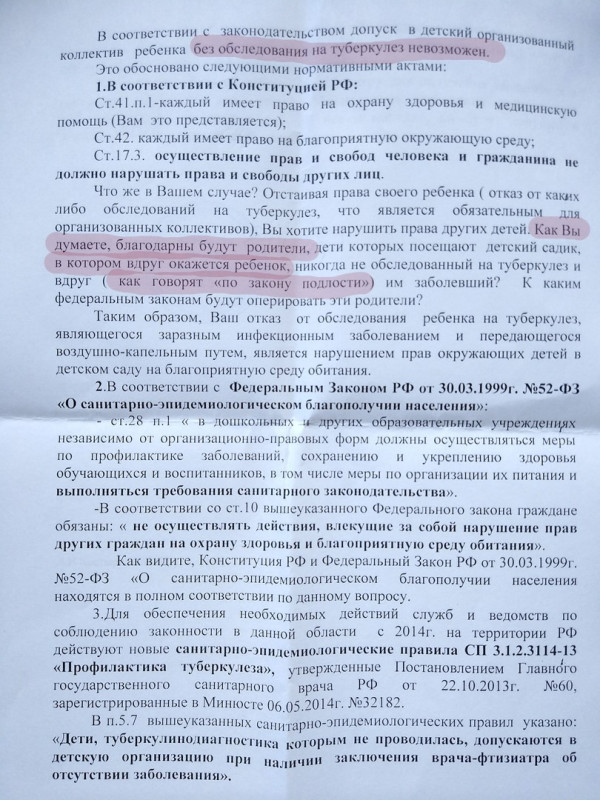 «К карте ребенка прикреплен отказ от всех профилактических прививок и от противотуберкулезной помощи, на который не обращают внимания ни медработники, ни заведующая садом. Ребенок обследован, имеются результаты рентгена (делали по показаниям), у родителей свежая ФЛГ — норма, на учете не состоим, в контакте с больными туберкулезом не были и не являемся социально неблагополучной семьей. Также у ребенка имеется справка от участкового врача-педиатра о том, что ребенок ЗДОРОВ. Нам навязывают услуги, заставляют посетить врача, это неправомерно. Ребенка отстранили от посещения д/с с 24.09.2018 г.»