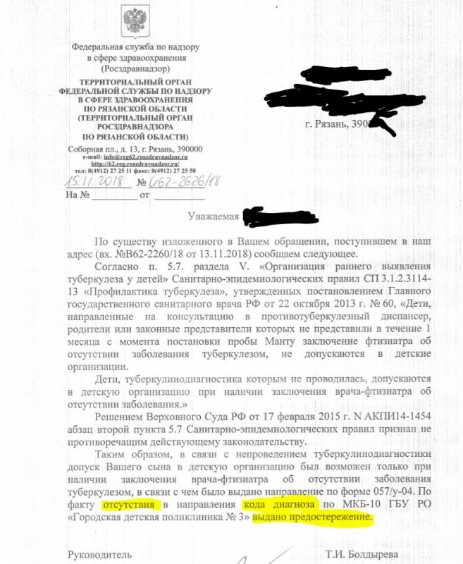 «Вы, как мама, лишили ребенка такой медицинской ПОМОЩИ, как обследование на туберкулез с помощью проведения туберкулинодиагности» (туберкулиночего???). Это точно пишет главврач?