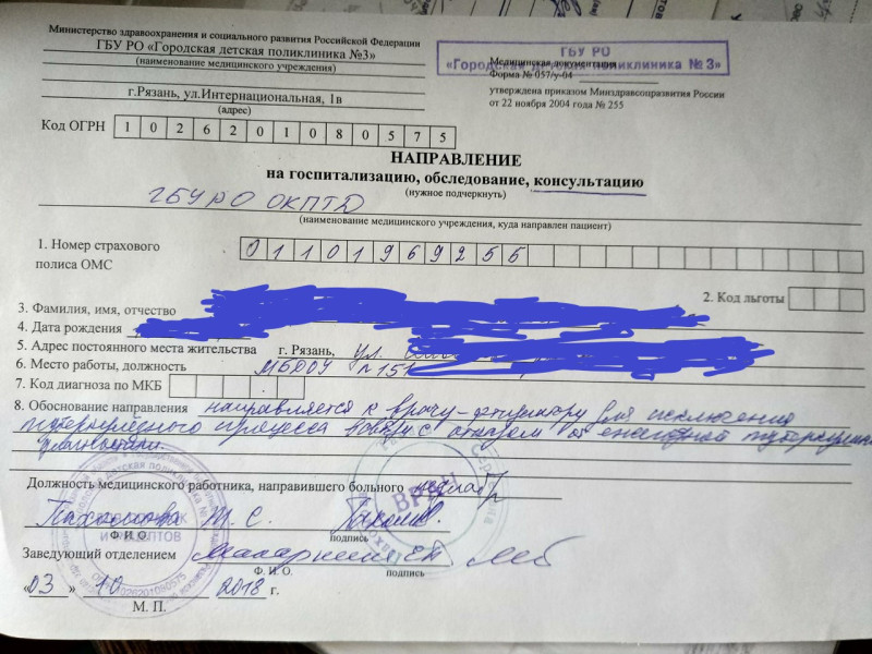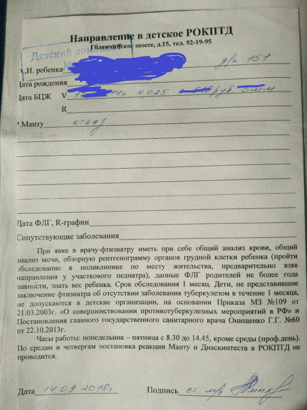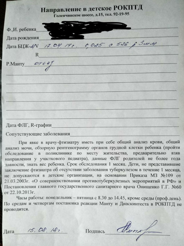 «Мне принесли на дом 3 октября другое направление по форме 057/у-04 на консультацию в туберкулезный диспансер, выписанный врачом педиатром Пахомовой Т. С. „Городской детской поликлиники №3“, куда мы даже не обращались!»