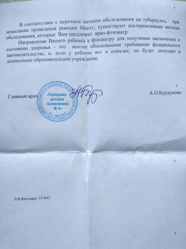 Мама задала конкретные вопросы: на каком основании ЗДОРОВОМУ РЕБЕНКУ были выписаны ТРИ филькиных грамоты, отправляющие его к фтизиатру?