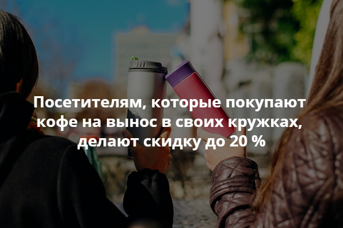 Как рассказал «Бумаге» директор сети кофеен COFFEERS Анатолий Побожев, посетителям с фирменными термостаканами в заведениях сети делают скидку с 2012 года. Кофейня сокращает использование одноразовых стаканчиков, а посетители делают ей дополнительную рекламу, когда используют термосы с логотипом заведения.