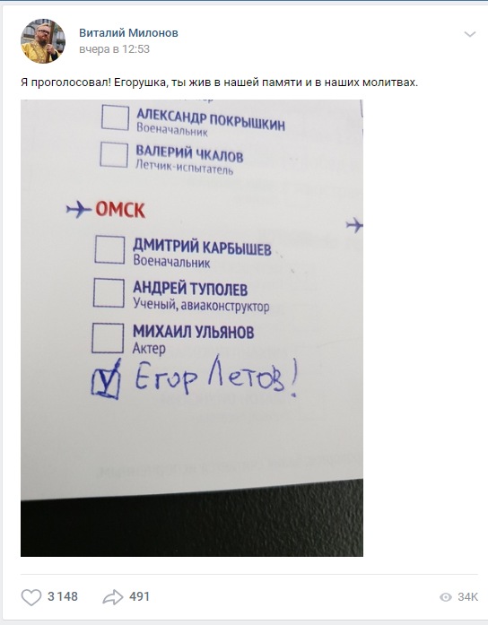 Виталий Милонов опубликовал на своей странице «Вконтакте» фотографию своей поддержки Егора Летова, вписав имя музыканта в бюллетень для голосования. Депутат ранее заявлял, что творчество Летова и группы «Гражданская оборона» внесло значительный вклад в культуру Советского Союза и России.