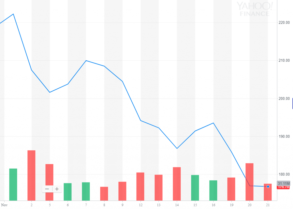 С начала ноября, когда был опубликован разочаровавший инвесторов последний отчет Apple, ее акции перестали быть «надежным укрытием от рыночных потрясений», писал CNBC. Первая в истории компания, которая продолжительное время сохраняла капитализацию выше отметки в $1 трлн, за неполный месяц потеряла в стоимости около $200 млрд — сейчас капитализация Apple около $840 млрд, свидетельствуют данные Bloomberg.