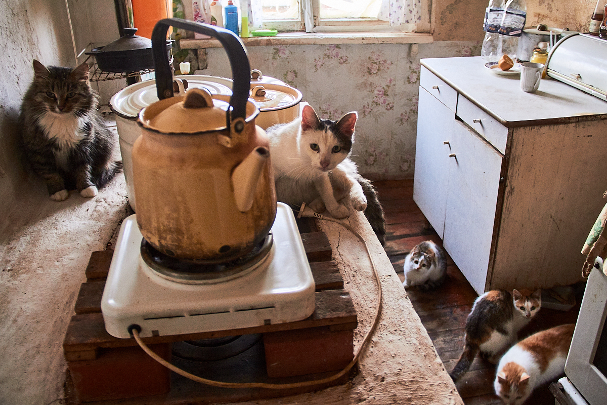 Вместе с одинокой пенсионеркой живут коты. Когда они голодны, все пятеро бегают за ней по пятам.