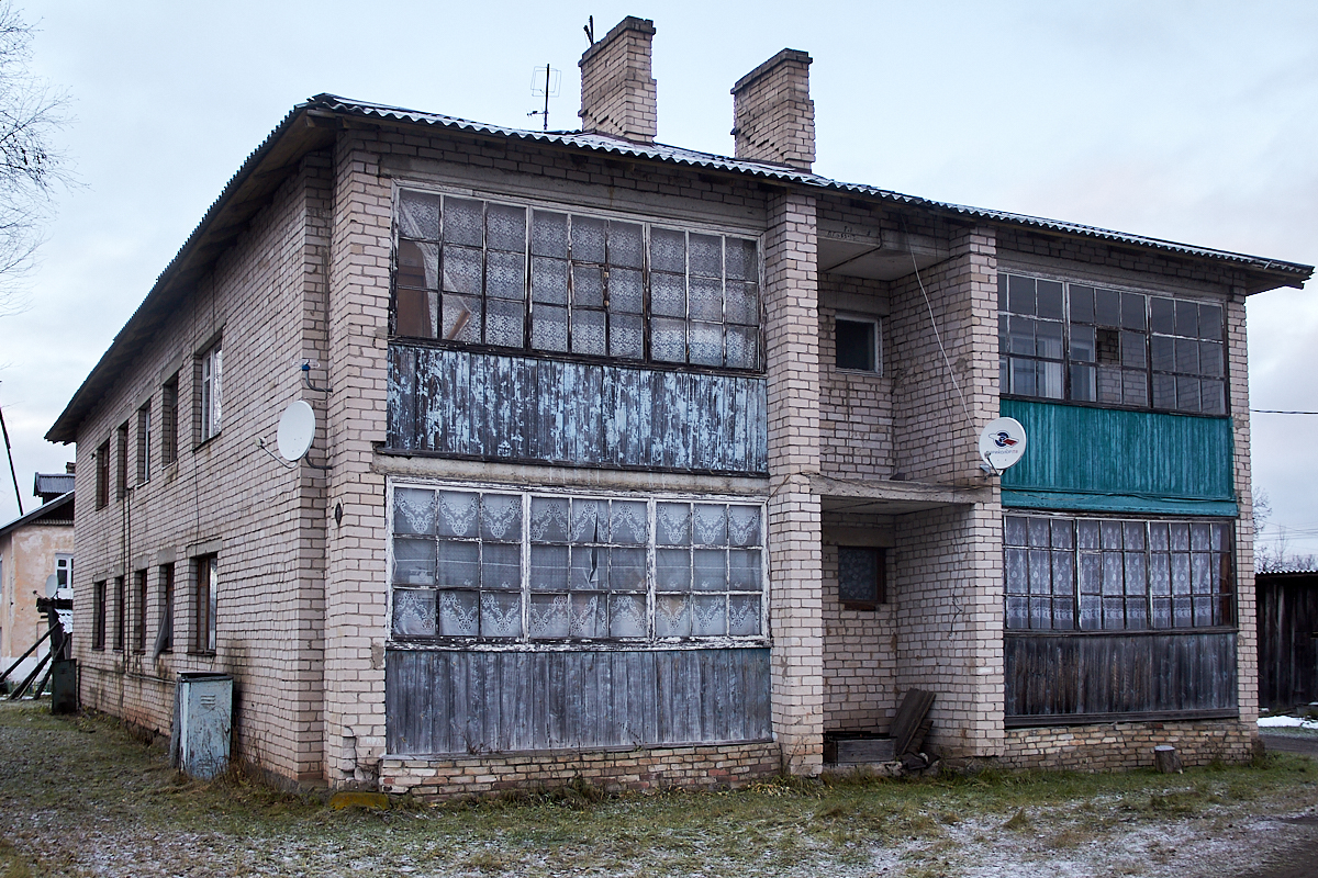 Дом казался добротным, пока был заселен. В 2011 году в одной из квартир случился пожар, после чего все жильцы быстро покинули и здание, и село, в котором не осталось работы. Тем не менее бывшие жильцы остались собственниками, и теперь почтовые ящики плотно забиты платежками. С этого времени дом, не знавший капитального ремонта, быстро стал разрушаться. Фундамент просел, стены покосились и стали продуваться ветром, внутренняя отделка посыпалась, лестница в подъезде накренилась.