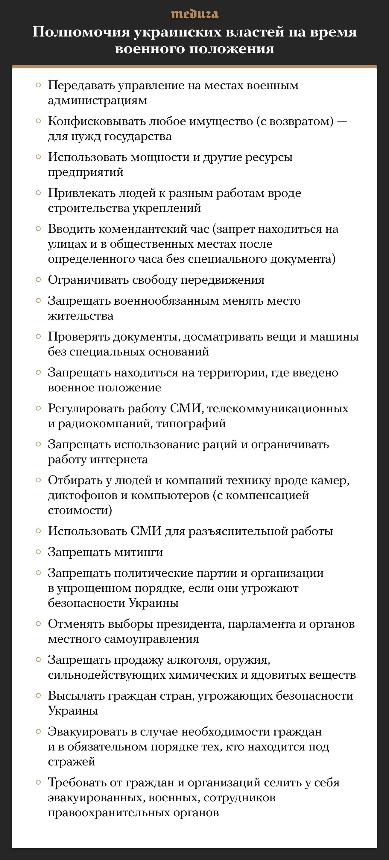 Президент Украины Петр Порошенко подписал второй указ о введении военного положения в стране. В отличие от первого, в нем упоминаются возможные ограничения конституционных прав и свобод — например, избирательного права и свободы слова.