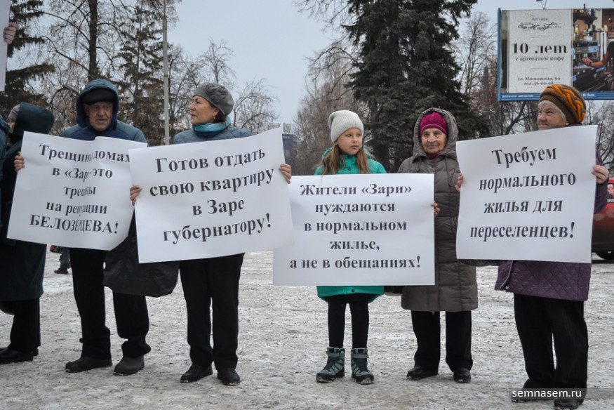 Жители микрорайона «Заря», которых переселили из ветхого и аварийного жилья, приехали со своими плакатами: «Трещины в домах в Заре — это трещины на репутации Белозерцева!», «Готов отдать свою квартиру в Заре губернатору!», «Жители Зари нуждаются в нормальном жилье, а не в обещаниях!».