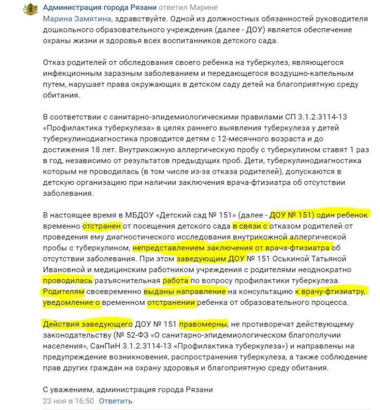 Администрация Рязани знатно обмишулилась на странице губернатора Николая Викторовича Любимова, ответив, что в детском саду №151 ЗАКОННО ОТСТРАНЕН от занятий ребенок и что без справки от ФТИЗИАТРА его в сад не пустят.