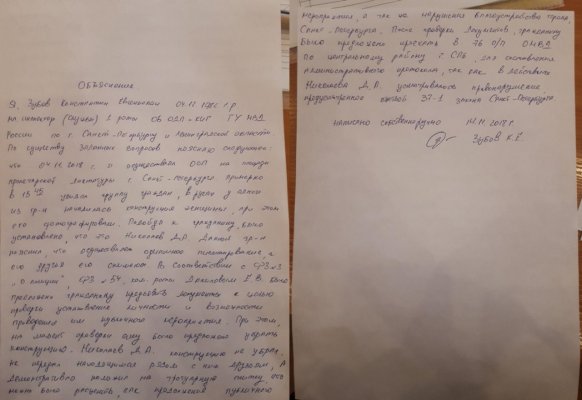 В объяснении сотрудник полиции, задержавший Николаева, указал, что перед задержанием активист «демонстративно положил (картонную женщину — ОВД-Инфо) на тротуарную плитку, что можно было расценить как продолжение публичного мероприятия, а также нарушение благоустройства города Санкт-Петербурга». Однако Николаев предоставил суду видеозапись, на которой видно, что на самом деле сотрудник полиции сам положил Бузову на тротуар.