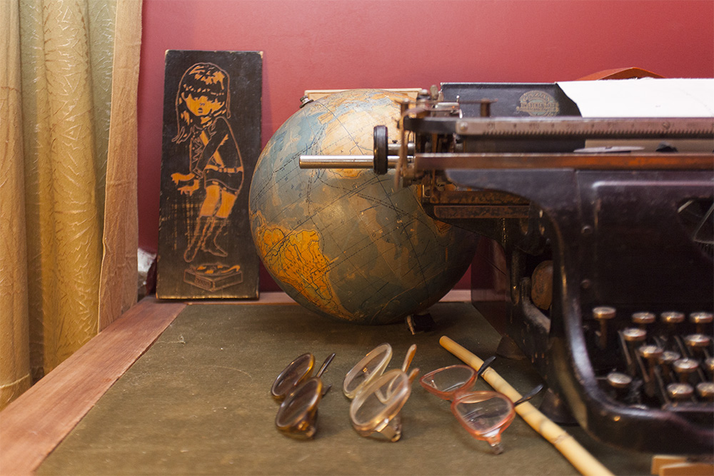 В квартире много пишущих машинок. Это и элементы декора, и театральный реквизит. Газеты, наклеенные на стены, — настоящие, старые, как и двери, которые мы специально подбирали. А стремянка стоит здесь всегда — она как бы говорит о незаконченном ремонте.