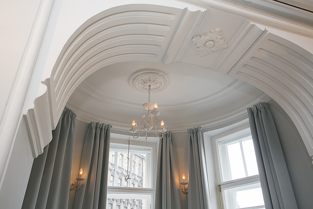 На кухне потолок полностью новый. Центральная розетка была полностью залеплена — на потолке был просто небольшой бугор. Реставраторы вытащили два куска [лепнины]: край и середину. Так мы смоделировали весь потолок.