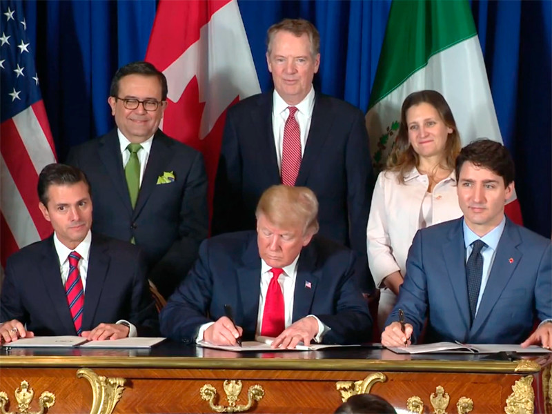 Президент США Дональд Трамп, премьер-министр Канады Джастин Трюдо и президент Мексики Энрике Пенья Ньето в пятницу на полях саммита G20 подписали новое торговое соглашение - USMCA, заменяющее прекратившее действие соглашение NAFTA, передает . Соглашение NAFTA, действовавшее с 1994 года, будет аннулировано. Новое соглашение USMCA впервые охватит сферу финансовых услуг, цифровой экономики.