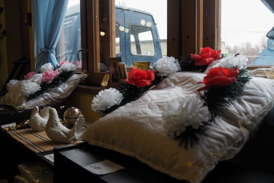 Помещение ритуальной конторы супругов Владимира и Лидии Титковых находится в оживленном и доступном месте, работает без выходных. Внутри просторного светлого помещения — ряды гробов, венков, крестов и других крупных и не очень принадлежностей для проведения похоронного ритуала. Гипсовые ангелы, траурные ленты. За рядами похоронных принадлежностей, в углу помещения, небольшая рабочая зона: хозяева сами обивают домовины, сами изготавливают венки и прощальные букеты. Так получается надежней и дешевле для них и для клиентов.