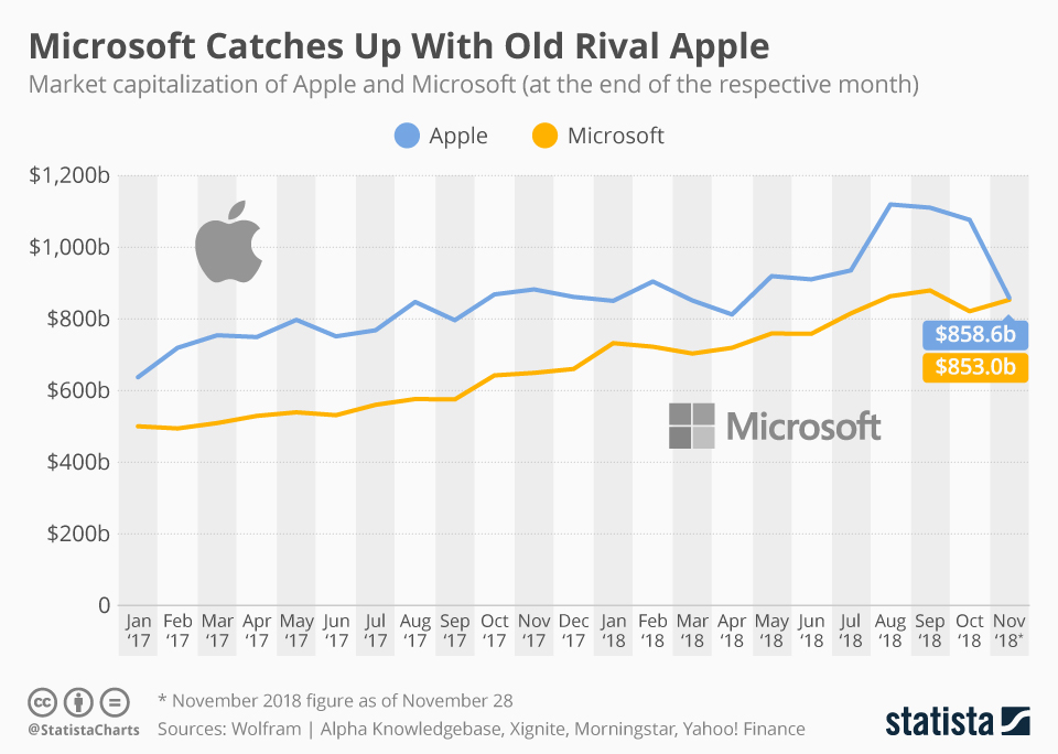 Потеря Apple лидерства по стоимости — во многом следствие собственных проблем компании, но рынок сходится в том, что Microsoft заслужила свое первое место. За четыре года новый CEO Сатья Наделла сделал из мастодонта, переживавшего экзистенциальный кризис, новую компанию, преодолев ее зависимость от сжимающегося рынка операционных систем и превратив в одного из лидеров стремительно растущего рынка облачных услуг.