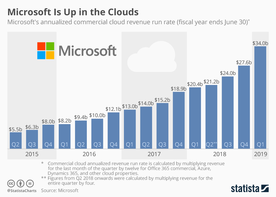 - Главной ставкой Microsoft стали облачные сервисы: у компании уже был готовый конкурентный продукт Microsoft Azure, а облачный рынок к середине 2010-х рос на десятки процентов в год. С 2015 по 2018 год Microsoft удвоила свою долю на рынка до 13% и стала самым серьезным конкурентом его лидера Amazon. Облачные сервисы приносят Microsoft уже почти треть выручки и остаются самым быстрорастущим сегментом. Даже сейчас аналитики считают, что крупнейшие игроки покрывают только 12% потребностей рынка, так что быстрый рост должен продолжиться.