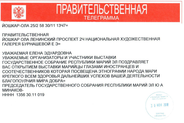 Елена Эдуардовна передала мне приветственную телеграмму от Госсобрания Республики Марий Эл.