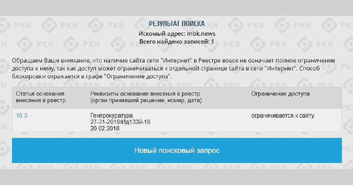 Сайт «МБХ медиа» на домене mbk.news был заблокирован Роскомнадзором 6 декабря по требованию Генпрокуратуры, следует из реестра ведомства. Это то же самое требование прокуратуры от 20 февраля 2018 года, по которому был заблокирован сайт mbk.media.