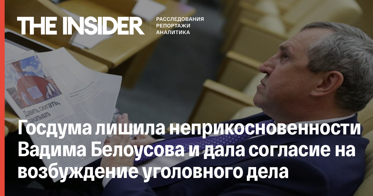 Госдума дала согласие на лишение неприкосновенности члена фракции «Справедливая Россия» Вадима Белоусова и возбуждение в отношении него уголовного дела. Об этом сообщается в постановлении, за которое проголосовало большинство депутатов на пленарном заседании.