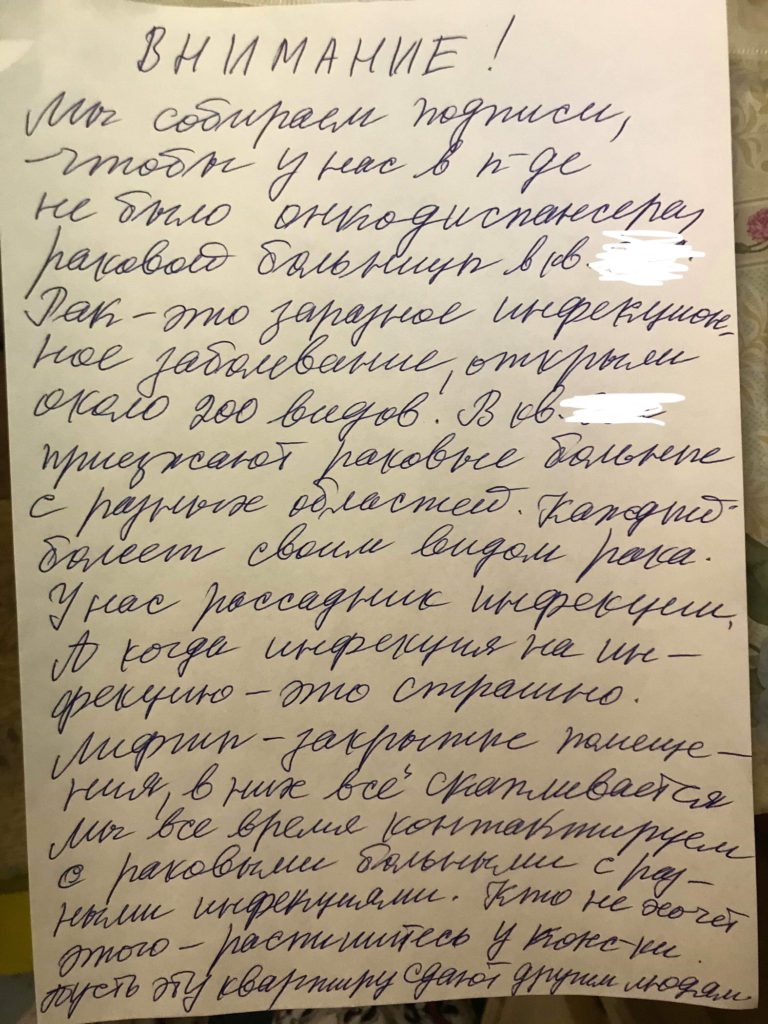 Старшая по подъезду оставила у консьержа обращение к жильцам, где назвала квартиру «онкодиспансером» и призвала людей проголосовать за запрет нахождения онкобольных в их доме.