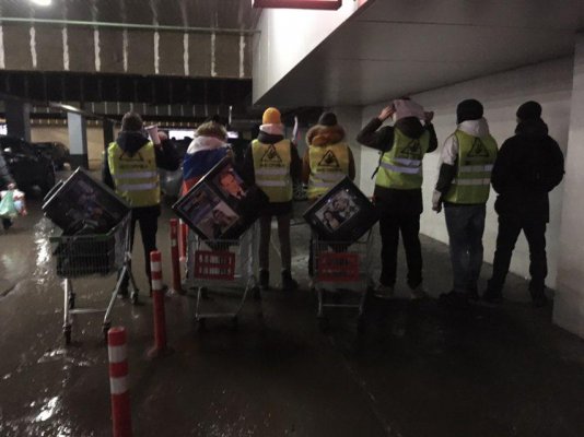 UPD 20:46 За активистом Алексеем Ивановым в отдел приехала скорая. Ему нужно сделать рентген, так как во время задержания на него упала тележка с телевизором. Три таких тележки активисты взяли с собой на прогулку.