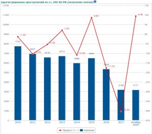 Детали. По данным сайта Генпрокуратуры Crimestat.ru, с января по октябрь зафиксировали 3171 случай получения взятки. В аналогичном периоде прошлого года было зафиксировано 2899 случаев. Рост составил 9,4%.
