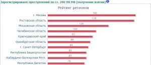 - Чаще всего взятки брали в Москве и Ростовской области — 182 и 179 дел соответственно, в топ-5 также попали Московская область (126 случаев), Челябинская область (100) и Краснодарский край (93 случая).