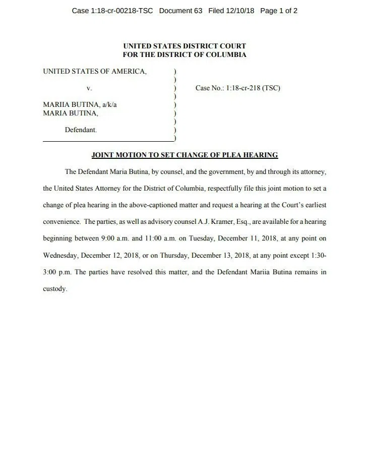 Россиянка Мария Бутина, которую в США обвиняют в незаконной работе иностранным агентом, вместе с прокурором подала в суд прошение о том, чтоб назначить в промежуток с 11 по 13 декабря слушание, на котором она признает свою вину, сообщает Reuters.