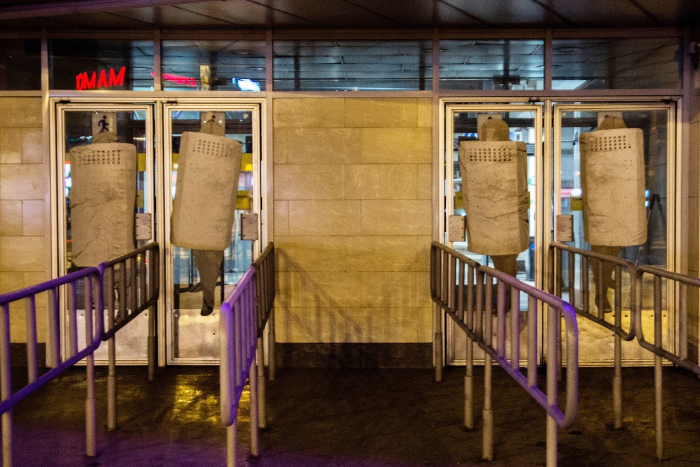 На дверях станции метро «Пионерская» наклеили плакаты с изображением ОМОНовцев. Фото работы опубликовали в группе Музея стрит-арта во «ВКонтакте», предположительно, она появилась в ночь с 9 на 10 декабря.