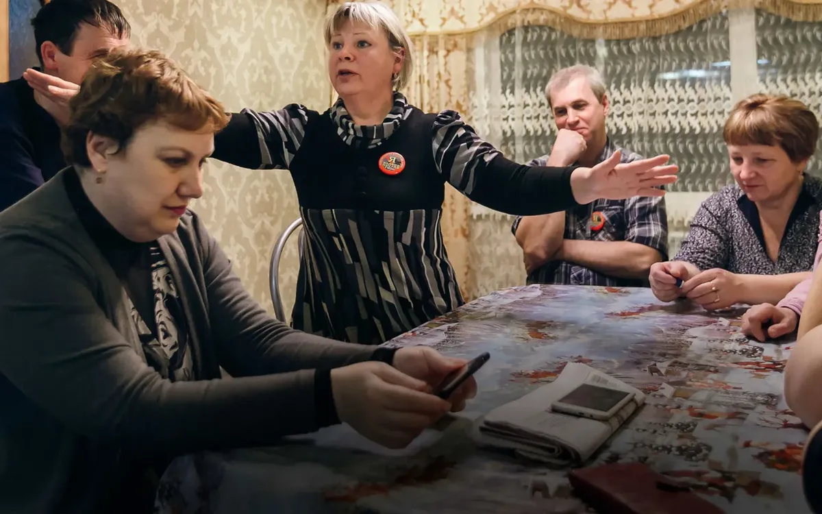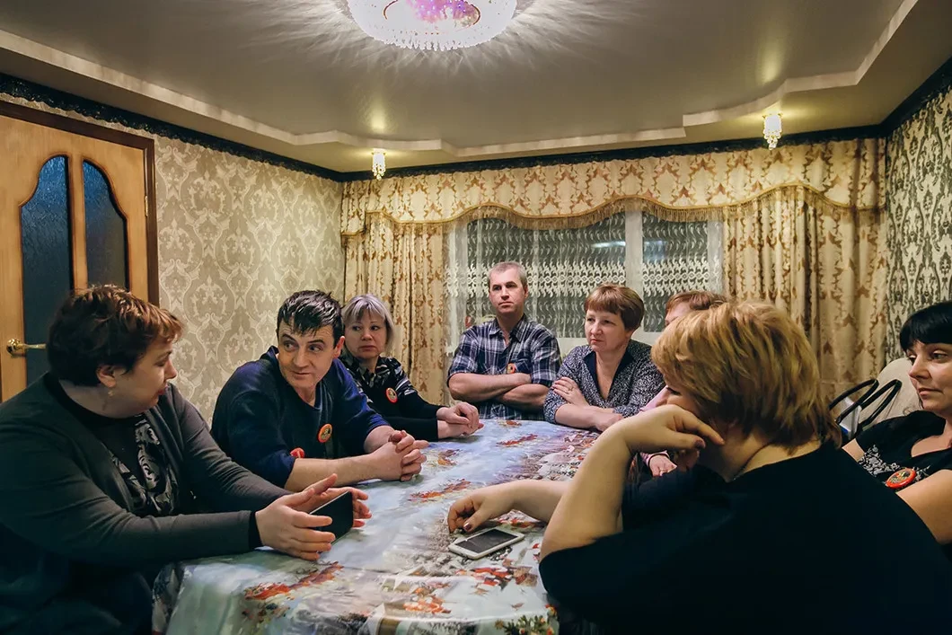 В это же время дома у Челпановых собирается другой совет — активистов. Директриса школы, библиотекарь, соцработница, пожарный, учительница начальных классов, обходчик… Мингалёв, словно боевые медали, цепляет на грудь два красных значка: «Я против свалки на станции Шиес» и «Поморье — не помойка».