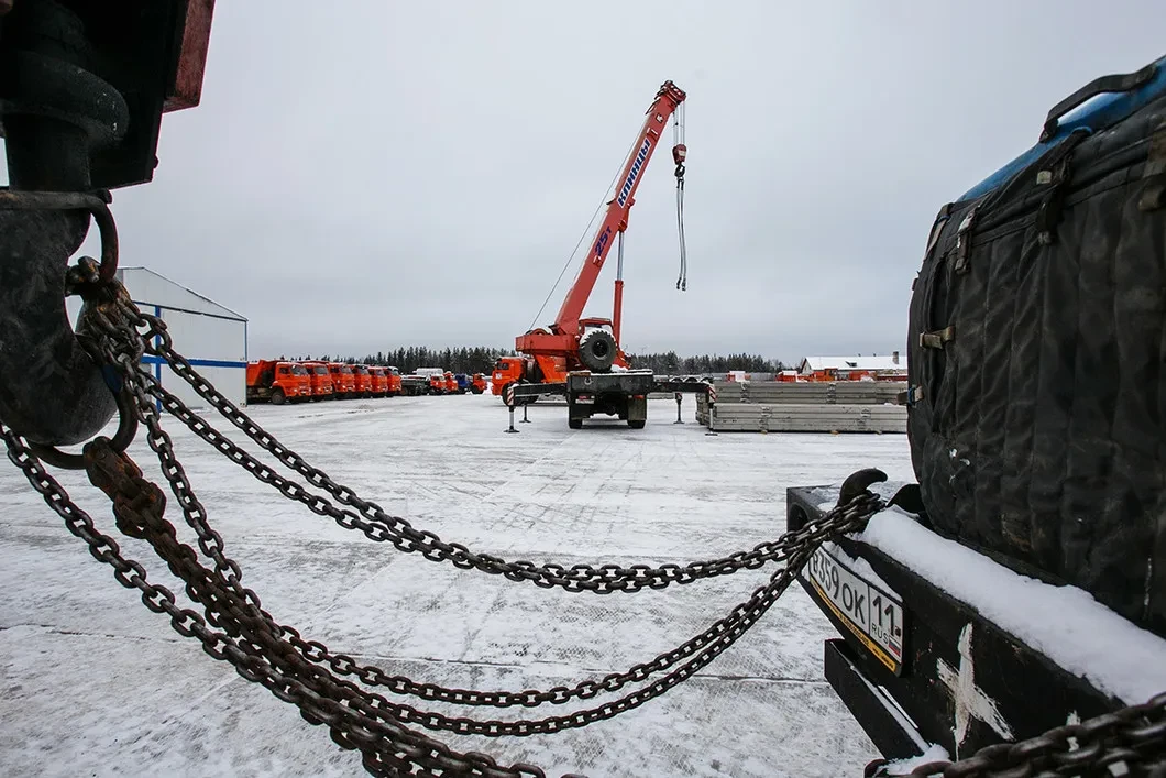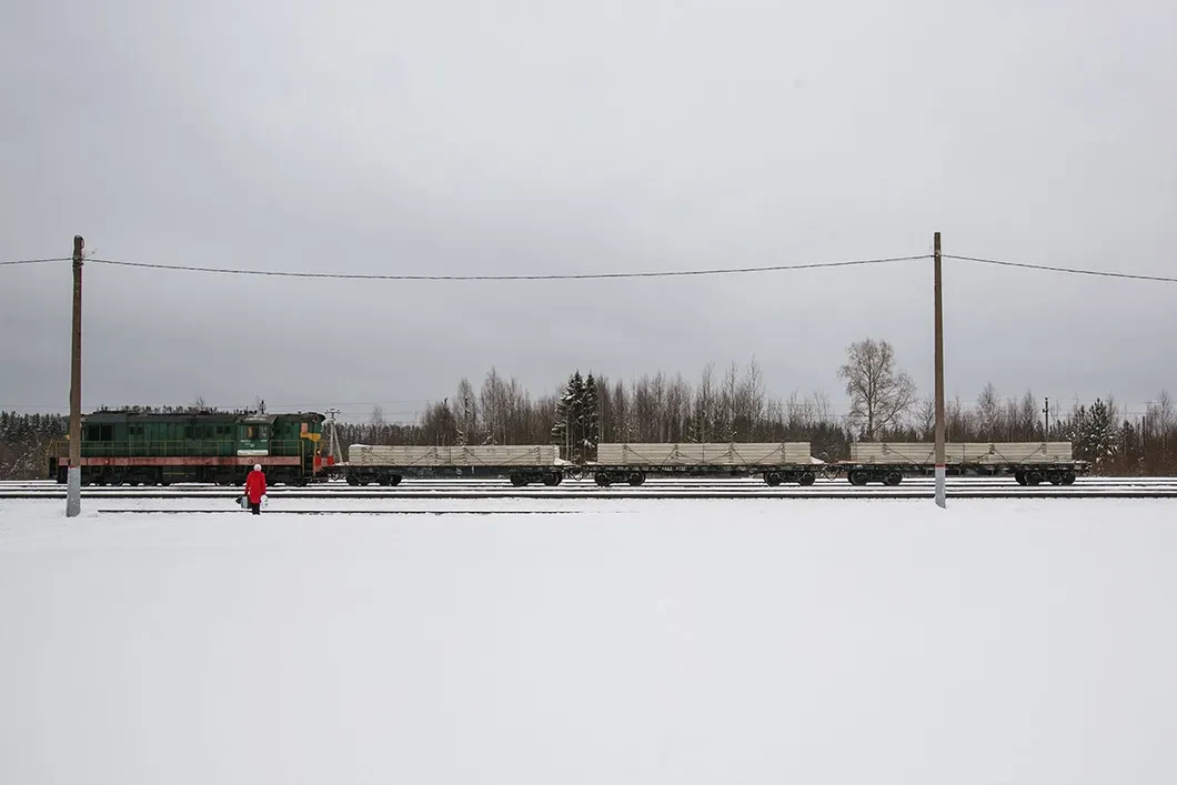 Основная стройплощадка находится у станционной конторы. Там ссыпаны горы щебня и песка. С подходящих платформ сгружают все те же плиты. За зданием станции ими выложен плац площадью с пару футбольных полей. Рабочие, как солдаты, меланхолично скалывают и сметают с него наледь. Здесь десятки самосвалов и автокранов, вертолетная площадка, двухэтажное модульное общежитие (активисты утверждают, что оно на винтовых сваях, то есть капитальное). Еще дальше — вырубка, которую затруднительно измерить даже в футбольных полях. Если верить официальным цифрам, общая площадь полигона составит 300 гектаров.