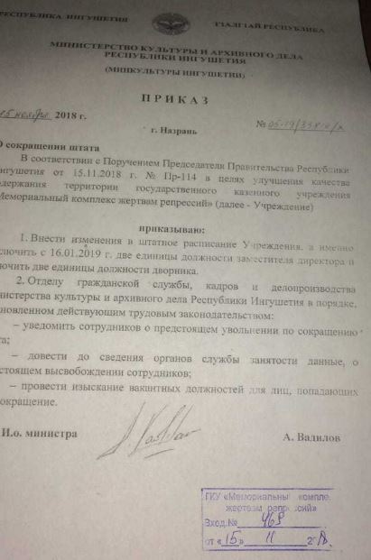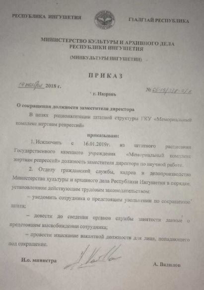В распоряжении "Кавказ.Реалии" оказались два приказа об увольнении Саутиевой – от 14 ноября и от 15 ноября. В первом документе говорится о сокращении одной должности – замдиректора музея по научной работе. В приказе от 15 ноября говорится, что в соответствии с поручением председателя правительства РИ от 15.11.2018 г. "в целях улучшения качества содержания территории" музея-мемориала в учреждении сокращаются два замдиректора, включая Саутиеву, а вместо них нанимаются два дворника.
