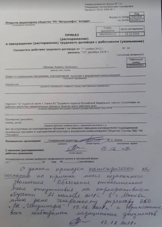 "На этой неделе, 11 числа, я вышла на работу, у меня потребовали объяснительную – почему я, пребывая на лечении в Москве, 26 октября не пошла на корпоративный семинар, куда меня приглашали от центрального офиса "Роснефти". Я написала объяснительную, приложила справки, что 26 октября я весь день провела у врачей, проходила обследования. Вчера утром я отдала объяснительную в канцелярию, ее в срочном порядке рассмотрели юристы – наши и из московского офиса. Они вынесли заключение: 'Оснований для увольнения нет'. Однако Беков наложил на это заключение резолюцию и выпустил приказ о моем увольнении", – говорит Матиева.