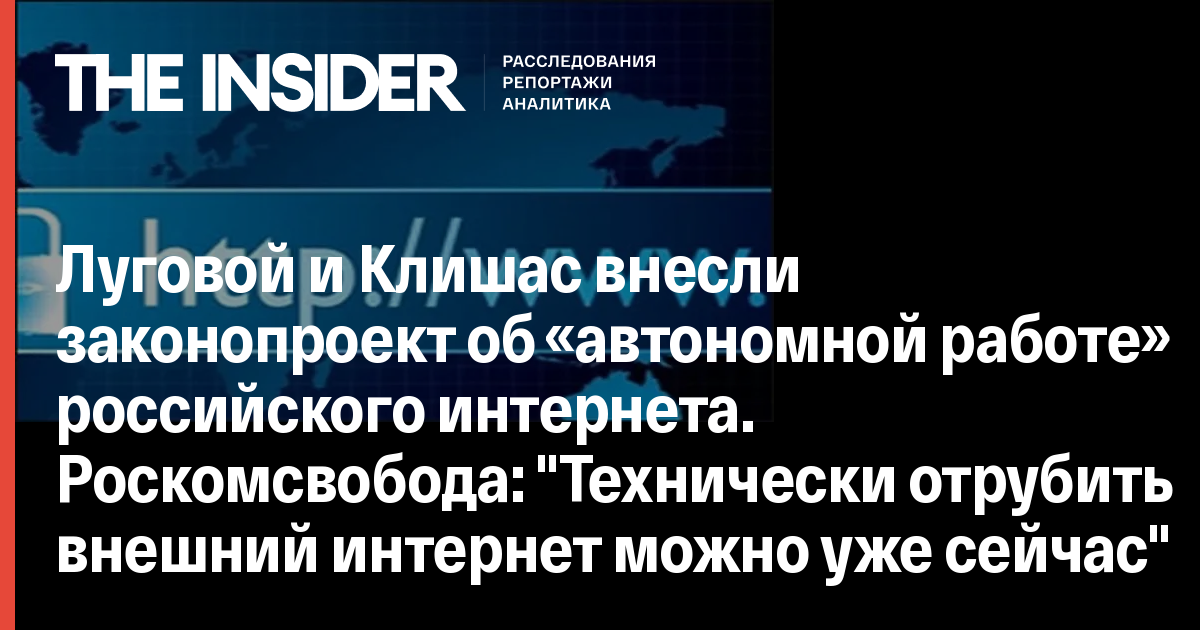 В Госдуму внесен законопроект об «автономной работе» российского сегмента интернета. Заявленная цель — «обеспечить работоспособность российских интернет-ресурсов в случае невозможности подключения российских операторов связи к зарубежным корневым серверам сети Интернет». Документ подготовили глава комитета Совета Федерации по конституционному законодательству и госстроительству Андрей Клишас, его первый заместитель Людмила Бокова и депутат Госдумы Андрей Луговой.