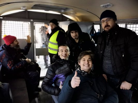 UPD 15:15 Полиция задержала Романа Лобачева, Дмитрия Иванова и одного несовершеннолетнего активиста. Их поместили в первый автозак, туда же перевели Гуда и Афанасьева. Автобус уже подъехал к отдел полиции по Мещанскому району.